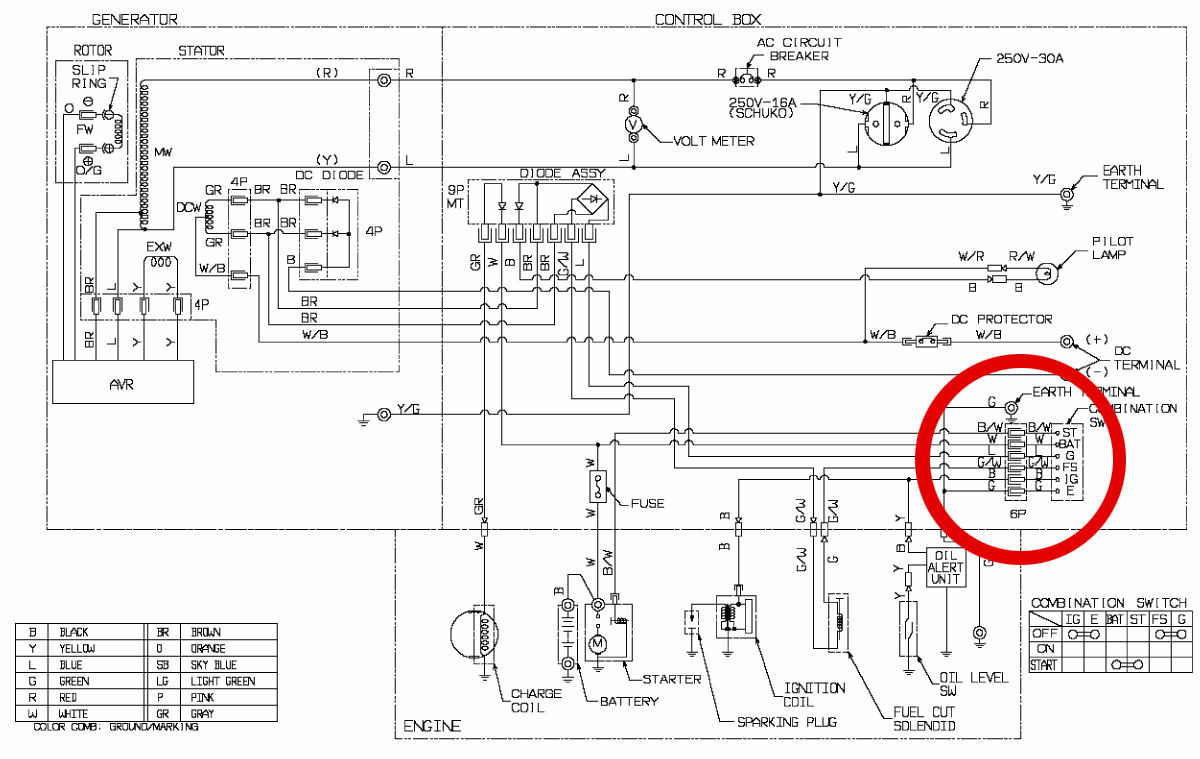 Задача была нестандартная и потому инересная.Генератор на объекте был уже установлен, это был генератор Energo 7600С, который запускался с помощью стартера, в итоге была спроектирована следущая схема. От гаража до дома был проложен кабель КВБбШв 10х1,5, в распределительном щите гаража устанвлены контакторы и реле контроля напряжения для переключения между сетью и генератором. Достаточно сложно было подключиться к самому генератору, т.к. он не предназначен для внешенего управления, пришлось подпаиваться к проводам замка зажигания. На схеме генратора замок зажигания выделен красным.