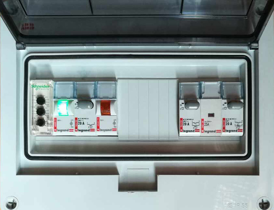 При условии что напряжение лежит в заданных пределах и все три фазы на вводе присутствуют реле KV1 включено, номально разомкнутый контакт реле KV1.1 в цепи питания катушки контактора КМ1 замкнут, питание гаража и дома осуществляется через контактор КМ1. Нормально замкнутый контакт реле KV1.2 разомкнут, что блокирует включение контактора КМ2.