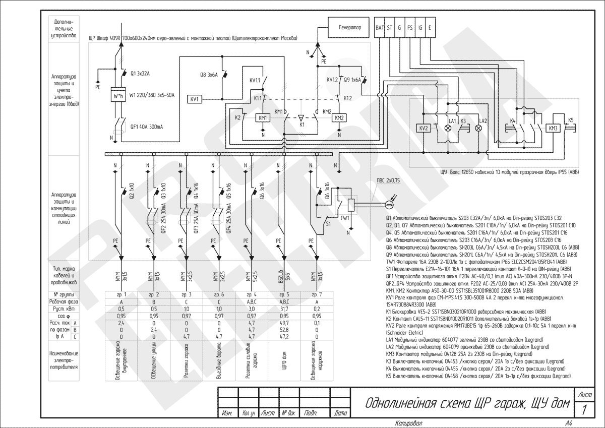 Когда после запуска генератора на вводе появится напряжение, включится реле KV1, контактор КМ2 отключится, КМ1 включится, питание дома и гаража переключится на внешнюю сеть. Контактор КМ3 остановит генератор.